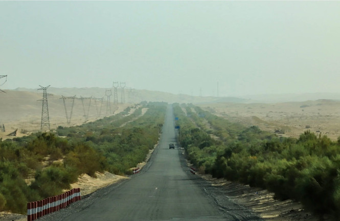 Ứng dụng công nghệ “đất hoá sa mạc” đầu tiên trên thế giới, Trung Quốc đã phủ xanh tuyến cao tốc sa mạc dài nhất ở Tân Cương bằng các khu rừng xanh rì.