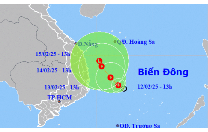 Vùng áp thấp trên khu vực giữa Biển Đông mạnh lên thành áp thấp nhiệt đới, dự báo sáng 14/2 đổ bộ vùng biển ngoài khơi từ Bình Định đến Ninh Thuận.