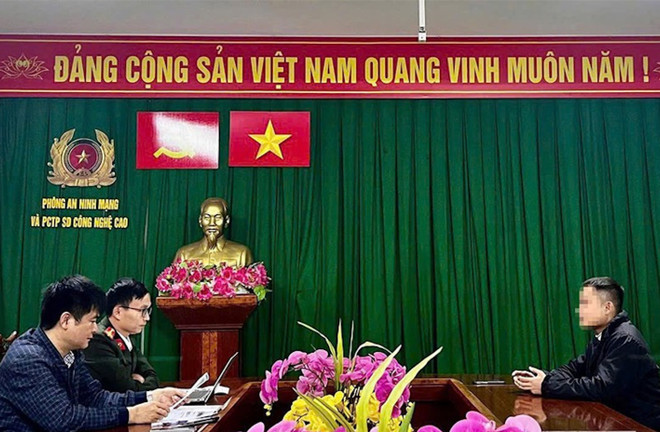 Cán bộ Phòng An ninh mạng và Phòng chống tội phạm sử dụng công nghệ cao Công an tỉnh Hà Tĩnh đang làm việc T.D.T. (Ảnh: CAHT)