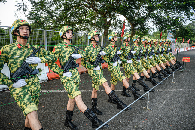 Sau 10 năm trở lại đội hình diễu binh, bộ đội phòng hóa luyện tập từ sớm, thực hiện các bài ke chân và đeo tạ 4,2kg dưới nắng gắt, chuẩn bị cho đại lễ A80.