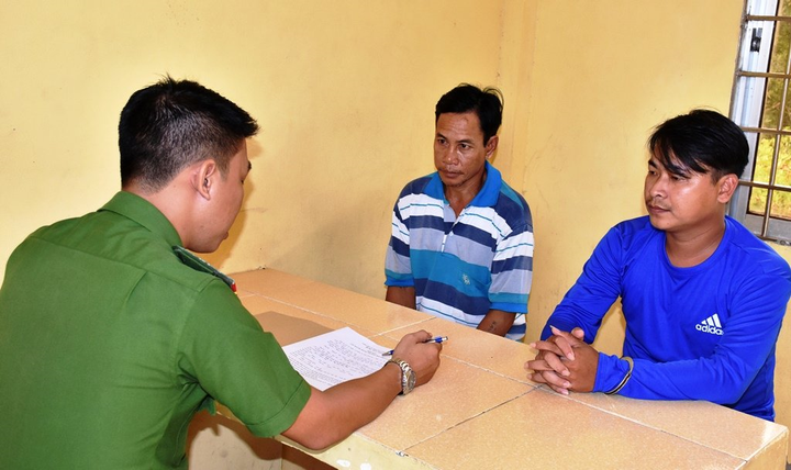 Trung (áo sọc) và con rể tại cơ quan công an.