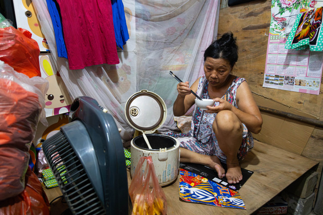 Bà Nhung (quê Hưng Yên) đã ở khu trọ này gần 10 năm. Hàng ngày bà sống bằng công việc thu gom ve chai ngoài chợ đầu mối Long Biên. Trung bình mỗi ngày, bà Nhung kiếm được 70.000 - 100.000 đồng.