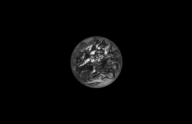 Theo NASA, bức ảnh trắng đen được Lucy chụp vào ngày 15/10, cho thấy Trái Đất lọt thỏm giữa không gian đen thẳm.