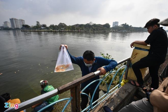 Một số người đứng sát mép nước bên bờ sông Sài Gòn để thả cá chép, khá nguy hiểm. Theo quan niệm dân gian, cá chép tiễn Táo quân chầu trời phải được thả trước giờ Ngọ (12h ngày 23 tháng Chạp). Do vậy, càng về trưa, người dân đến thả cá chép càng nhộn nhịp.