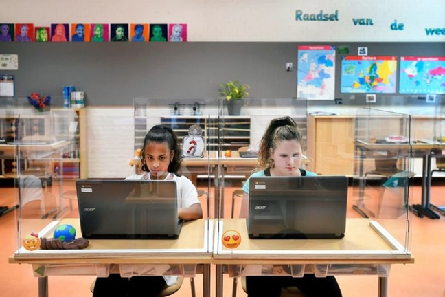 Tại Hà Lan, khi học sinh trở lại trường học, Chính phủ ban hành hướng dẫn phòng dịch cho các cơ sở giáo dục trên cả nước. Cụ thể, phòng học và hành lang được lắp đặt hệ thống thông gió, nhằm hạn chế sự lây lan của COVID-19. Theo Nederlandse Omroep Stichting, các trường học không bắt buộc học sinh đeo khẩu trang. Tuy nhiên, bàn học được lắp vách ngăn để hạn chế lây nhiễm. Với những học sinh tiếp xúc gần bệnh nhân nhiễm bệnh, nhà trường cho các em nghỉ học để theo dõi tình hình sức khỏe. (Ảnh: US News)