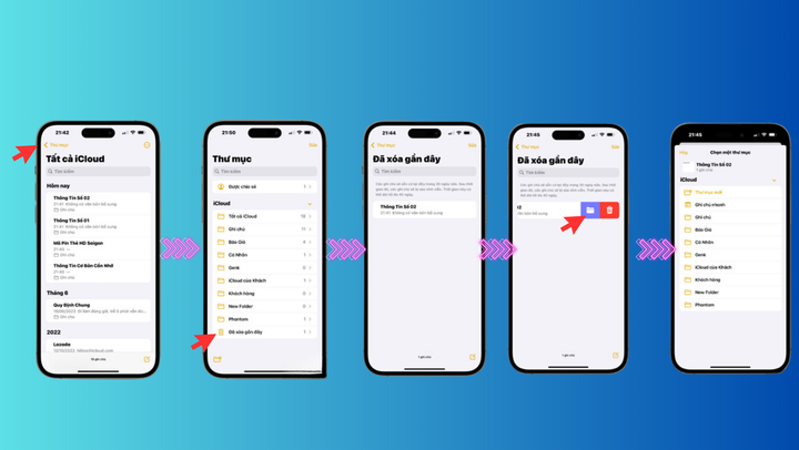 Để khôi phục lại, bạn chỉ việc mở lại ứng dụng Ghi chú, nhấn vào Thư mục. Tiếp theo, nhấn vào thư mục “Đã xóa gần đây” và tìm đến ghi chú bạn muốn khôi phục. Sau đó nhấn và kéo ghi chú sang trái rồi nhấn chọn vào hình thư mục màu tím và chọn lại vị trí mình cần lưu lại ghi chú là xong.