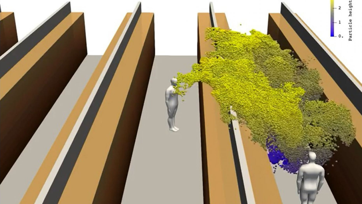 Trong mô hình 3D, một người mang mầm bệnh đứng giữa 2 gian hàng, ho trong trong điều kiện thông gió. Sau khi người này ho, một đám mây khí dung lan tỏa trong không khí vượt qua kệ hàng và tiếp cận người đứng ở kệ hàng cạnh đó dù 2 người này không hề nhìn thấy nhau.