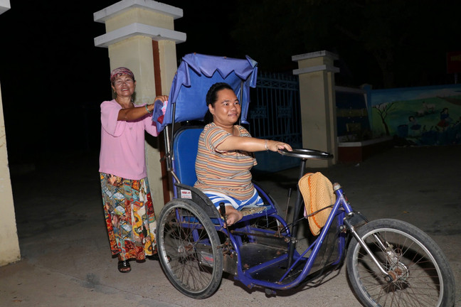 Đồng hồ điểm 18h30 cũng là lúc bà Thành Thị Thiên đẩy xe lăn cùng con là Lý Thị Hương (31 tuổi) bị khuyết tật, vượt quãng đường hơn 1 km đến lớp học xóa mù chữ tại điểm trường TH - THCS Mai Thúc Loan.