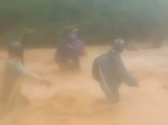 Trong clip, nước suối dâng cao chảy cuồn cuộn, đục ngầu trong mưa lớn. Bên kia suối, một nhóm người dân đang đứng đợi sẵn. Không ngần ngại, nhóm cán bộ xã băng qua dòng suối chảy xiết, lần lượt dìu từng người qua suối.
