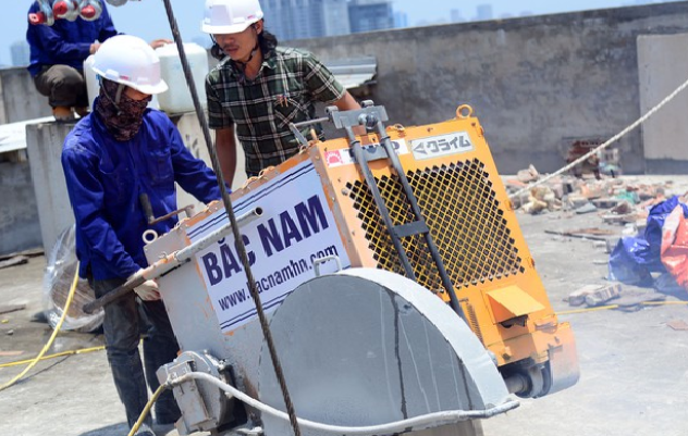 Trong sáng ngày 20/5, lực lượng thi công của Công ty cổ phần đầu tư xây dựng dân dụng Bắc Nam đã dùng máy cắt hiện đại với lưỡi kim cương tiến hành cắt mặt sàn bê tông cốt thép trên tầng thượng.