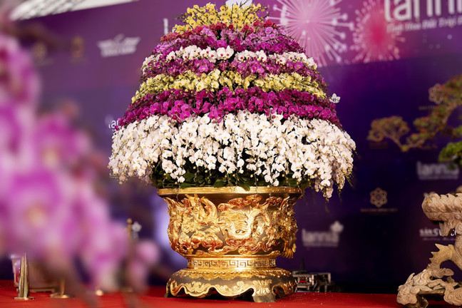 Anh Ngô Văn Nghiệp, chủ nhân gian hàng cho biết, chậu lan này được đặt tên là “Cửu Long tranh châu”, cao khoảng 5m, được ghép bởi 2.686 cành hoa lan hồ điệp, sử dụng 9 màu hoa lan tạo thành chín tầng. Bình đá được tạc riêng và sử dụng hết 5 lượng vàng để dát.