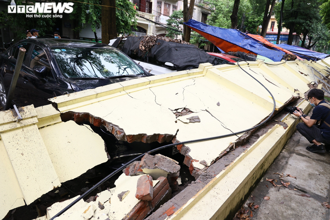 Sáng 8/7, bức tường dài khoảng 50m, cao 1,5m được lắp thêm hàng rào sắt cao 1m tại ngõ 245 Mai Dịch (phường Mai Dịch, quận Cầu Giấy, Hà Nội) bất ngờ đổ sập, đè trúng 13 ô tô đang đỗ trên vỉa hè.