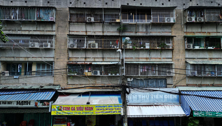 Quanh các tòa nhà của khu chung cư có tuổi đời hơn 50 năm này, dây điện quấn ngang chằng chịt như tổ nhện khổng lồ.