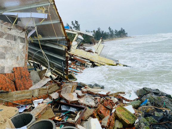 "4 trong số 7 ngôi nhà bị sập cách đây 3 năm là của 4 anh em tôi. Nuốt nước mắt, cả 4 anh em chạy vạy vay mượn, dốc sức sửa sang lại nhà cửa để vợ chồng, con cái có chỗ tránh nắng che mưa. Nào ngờ, khi nỗi mất mát cũ vừa vơi đi thì thảm cảnh sập nhà lại một lần nữa tái diễn. Do ảnh hưởng của bão NESAT hồi tháng 10/2022, sóng cao 3-4m cuộn trào khiến 4 ngôi nhà của 4 anh em tôi đặt trong tình trạng báo động. Khi bão đi qua, nhà nào nhà nấy đều bị quật sập một phần" - chị Hường nói.