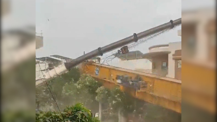 Cần cẩu nặng hàng chục tấn tại dự án tàu điện ngầm ở Surat, Ấn Độ đang nâng khối sắt bất ngờ đổ sập xuống tòa nhà gần đó khiến giao thông trong khu vực hỗn loạn.