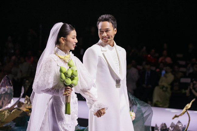 Hạ Anh xuất hiện với áo dài cưới trắng tinh khôi, khoác khăn voan mỏng và ôm bó hoa sen, toát lên vẻ đẹp thanh thuần. Trong khi đó, Lâm Thanh Nhã gây ấn tượng với vest trắng cách điệu phối cùng áo dài, vừa hiện đại vừa truyền thống.