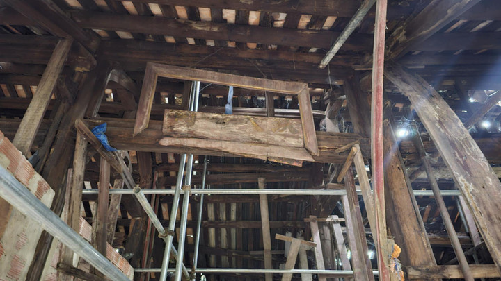 Bên trong di tích, lực lượng chức năng phải sử dụng các trụ sắt để gia cố, bảo vệ, tránh đổ sập.