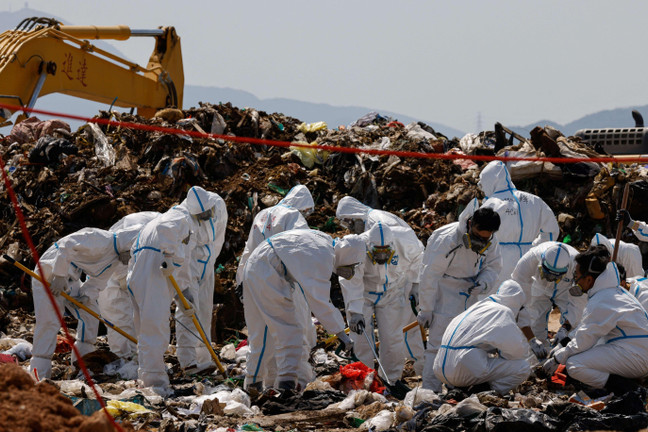 Trong ảnh, cảnh sát đào bới bãi rác để tìm kiếm các bộ phận còn thiếu trên thi thể của người mẫu 28 tuổi Abby Choi.