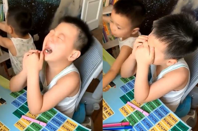 Một đoạn video hài hước ghi lại cảnh hai anh em cùng ngồi trên bàn học, trong khi người em trai loay hoay không yên thì cậu anh trai bên cạnh bật khóc nức nở, khiến người mẹ phải lập tức chạy vào kiểm tra tình hình. Sự việc được cho là xảy ra ở Trung Quốc.