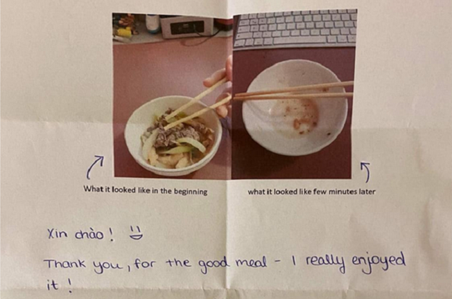 Theo đó, trong một dịp tình cờ gặp người bạn cùng chung khu trọ khi đang nấu ăn, anh của cô gái đã sẵn tiện mời người này một phần ăn. Tưởng chừng mọi chuyện chỉ dừng lại đó, nhưng cô bạn người Đức này đã có màn cảm ơn đầy đáng yêu bằng một bức thư tay được đầu tư khá kỹ lưỡng khi nghiên cứu cả tiếng Việt lẫn chèn hình ảnh minh họa vô cùng chân thật.