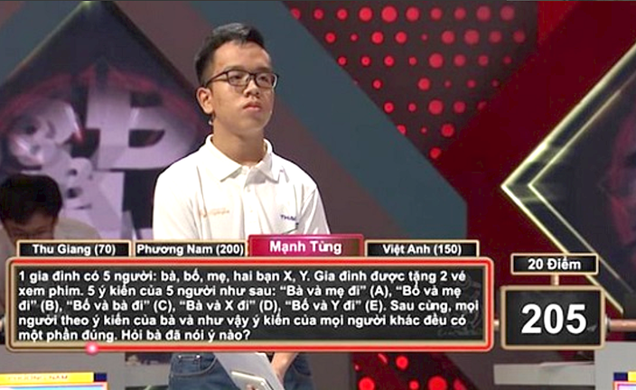 Câu hỏi có nội dung như sau: "1 gia đình có 5 người: Bà, bố, mẹ, hai bạn X, Y. Gia đình được tặng 2 vé xem phim. 5 ý kiến của 5 người như sau: "Bà và mẹ đi" (A), "Bố và mẹ đi" (B), "Bố và bà đi" (C), "Bà và X đi" (D), " Bố và Y đi" (E). Sau cùng mọi người theo ý kiến của bà và như vậy ý kiến của mọi người khác đều có một phần đúng. Hỏi bà đã nói ý nào?".