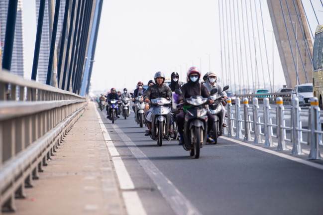 Từ 16/9, Sở Xây dựng Hà Nội lắp đặt 2 giá long môn và hàng rào để tách riêng làn ô tô và xe máy trên cầu Nhật Tân theo hướng vào sân bay Nội Bài. Từ 4 làn xe hỗn hợp mỗi chiều, cầu Nhật Tân được phân ra 3 làn ô tô và 1 làn xe máy bằng hàng rào sắt.