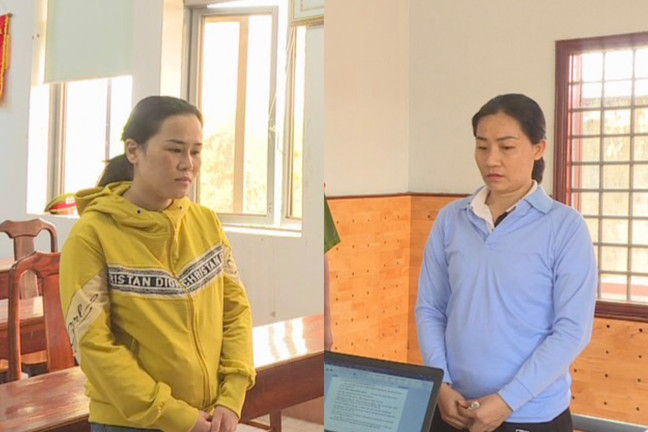 Đinh Lê Lê Na (áo vàng) và Trần Thị Nguyên Hằng tại cơ quan điều tra. (Ảnh: Sỹ Đức)