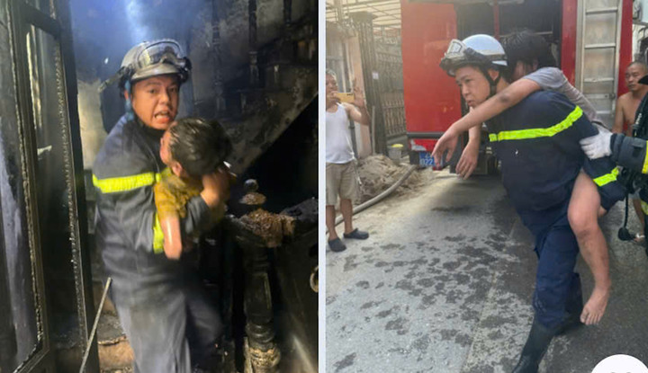 Ngôi nhà xảy ra cháy nằm trong ngõ sâu ở phố Bắc Cầu (Hà Nội), cảnh sát tiếp cận hiện trường, đưa được 3 nạn nhân bị mắc kẹt ra ngoài an toàn.