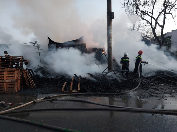Tại hiện trường, lực lượng chức năng nhanh chóng giải cứu 6 người dân sống cạnh cơ sở này ra ngoài an toàn và ngăn chặn đám cháy lan sang nhà dân.
