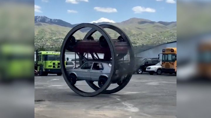 Chiếc xe quái dị ở Mỹ, gồm 2 chiếc ô tô chồng lên nhau kết nối với một bánh xe khổng lồ và chạy theo vòng tròn.
