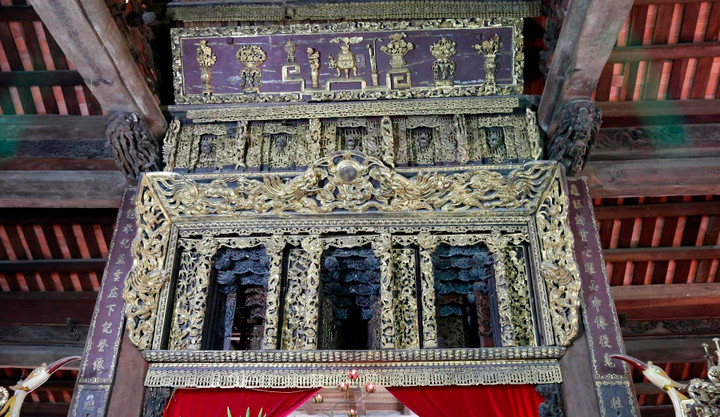 Điều đặc biệt là cửa võng được làm bằng gỗ sơn son thếp vàng và gốm kết hợp với nhau hài hòa tạo ra những mảng trang trí độc đáo.