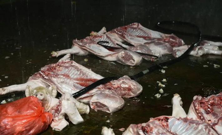 Thịt lợn được giết mổ tại lò mổ bất hợp pháp của Lê Văn Tươi và Nguyễn Thị Thư ở Đan Nhiễm, Hà Nội. (Ảnh: Công an TP Hà Nội)