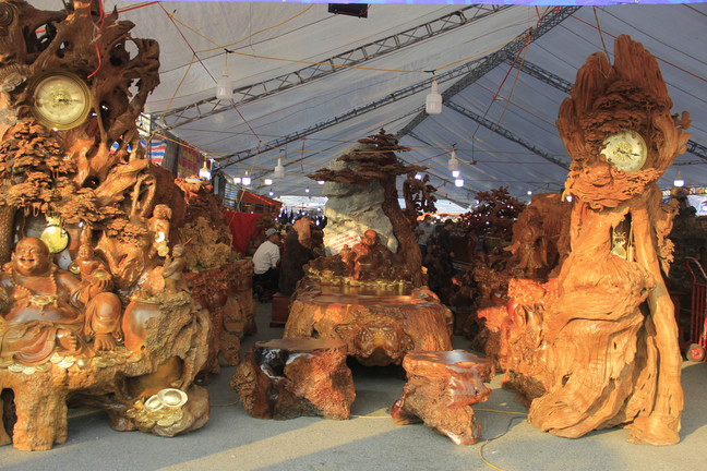 Bộ bàn ghế “Cửu lân quần tụ” được làm từ gỗ nu kháo, đang được trưng bày và chào bán với giá gần 3 tỷ đồng tại Festival Sinh vật cảnh Hà Nội.