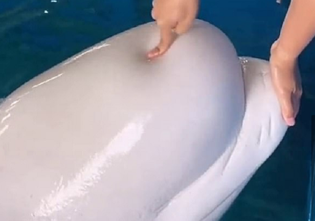 Những hình ảnh này được ghi lại tại một thủy cung ở Thâm Quyến, Trung Quốc hôm 12/8. Trong đoạn video, người đàn ông chọc và bóp đầu con cá voi để những đứa trẻ gần đó thấy được nó mềm thế nào.