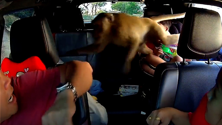 Con khỉ nhảy vào ô tô và cướp đồ ăn trên tay của cậu bé khi gia đình lái xe qua khu rừng ở tỉnh Prachuap Khiri Khan, Thái Lan.