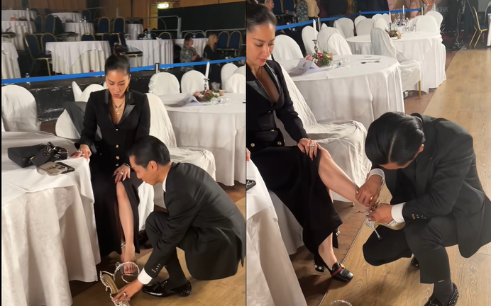 Mới đây, Phan Hiển đăng tải đoạn clip ngắn ghi lại cảnh anh quỳ gối thay giày cho Khánh Thi ngay tại sự kiện, một số khán giả nhận xét anh "làm màu".