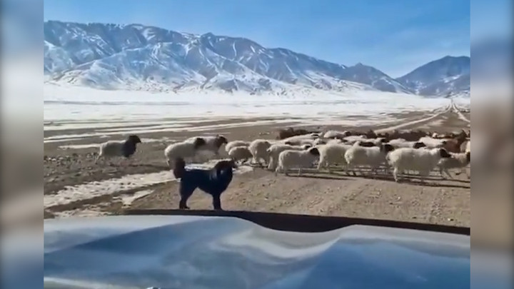 Một con chó chạy đến chặn chiếc ô tô và từ từ lùa đàn cừu sang bên đường an toàn tại Mông Cổ.
