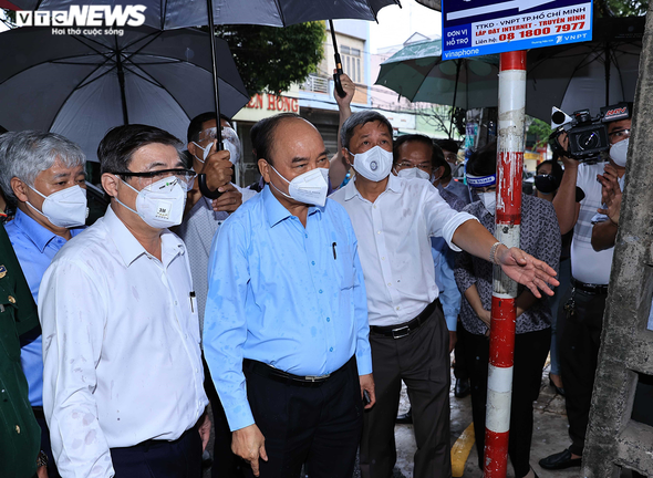 Trong khuôn khổ chuyến đi, Chủ tịch nước Nguyễn Xuân Phúc cùng đoàn lãnh đạo TP.HCM đã đến thăm khu vực phong tỏa tại khu phố 1, thị trấn Hóc Môn, huyện Hóc Môn.