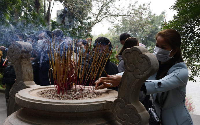 Người dân làm lễ tại phủ Tây Hồ đeo khẩu trang phòng dịch (ảnh: Linh Hồng)