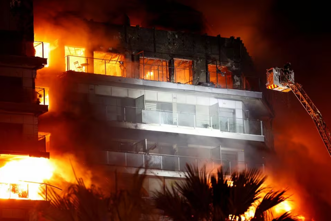 Đám cháy bao trùm tòa chung cư ở thành phố Valencia, Tây Ban Nha, ngày 22/2. (Ảnh: Reuters)
