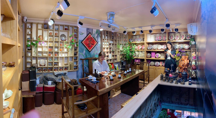 Giữa không gian tĩnh mịch là một căn phòng nhỏ để du khách thưởng trà. Chủ nhân “làng trà”, anh Lê Trần Trung thuần thục pha ấm trà nhỏ. Mùi trà thơm ngát, tỏa hương vừa thanh vừa ngọt khiến cái nóng của mùa hè như giảm xuống vài phần.