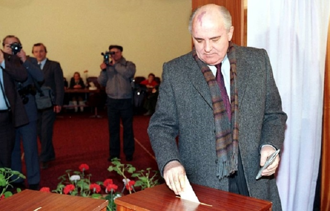 Tổng thống đầu tiên và duy nhất của Liên Xô, Mikhail Gorbachev, bỏ phiếu trong cuộc trưng cầu dân ý ngày 17/3/1991. (Ảnh tư liệu: ТАSS)