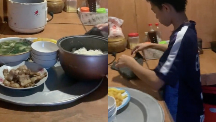 Đoạn clip xúc động đang được dân mạng chia sẻ cho thấy cậu bé 8 tuổi vừa nấu xong bữa cơm gồm thịt rang, khoai chiên, canh mướp và đang chờ mẹ đi làm về.