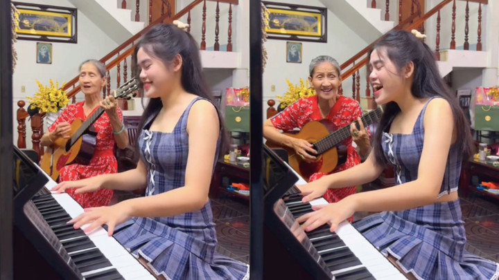 Clip ghi lại hình ảnh cháu gái 18 tuổi ngồi đàn hát cùng bà nội 66 tuổi ca khúc "Thì thầm mùa xuân" khiến cộng đồng mạng mê mẩn, khen đây là màn kết hợp tuyệt vời.