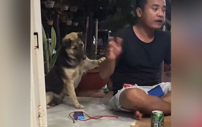 Mặc kệ chủ đang ngồi nhậu và tâm sự với bạn, chú chó vẫn kiên trì ngồi bên, liên tục khều tay chủ đến khi được cho ăn mới thôi.