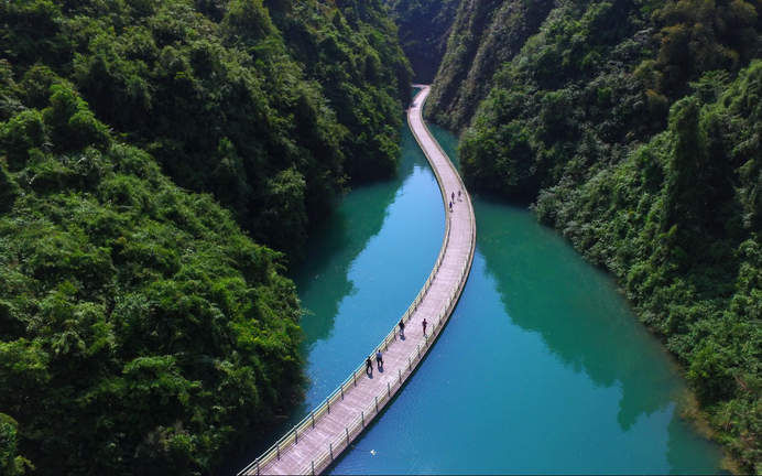 Sự ra đời của con đường bộ bằng gỗ này cho phép du khách chiêm ngưỡng một phần của thung lũng hùng vĩ này, nơi mà trước đây chỉ có thể đến được bằng thuyền. Dạo bước trên cầu nổi Shiziguan, du khách được trải nghiệm cảm giác đầy thú vị như đang đi trên mặt nước.