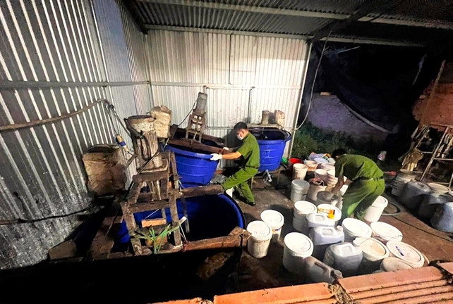 Cụ thể, cơ quan công an phát hiện tại căn nhà nói trên có 3 bồn chiết dung dịch, các loại máy móc dùng để pha chế, đóng gói, thùng hóa chất, thùng carton, vỏ xô nhựa, nắp chai nhựa, cân…