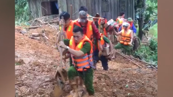 Sau khi đên hiện trường, lực lượng chức năng phối hợp với người dân dùng cuốc, xẻng đào bới tìm người mất tích tại thôn Tà Rùng, xã Húc, huyện Hướng Hóa, Quảng Trị.