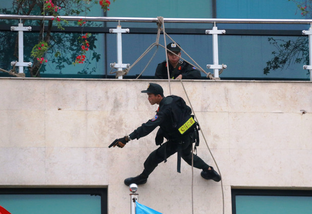 Công an mang súng, đu dây trong tình huống giả định chống nhóm cướp ngân hàng có trang bị vũ khí.