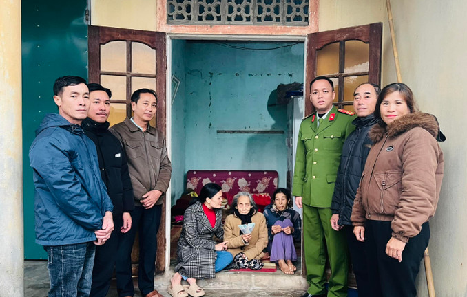 Lãnh đạo Công an xã Vĩnh Thái cùng chính quyền địa phương đến thăm hỏi, động viên gia đình chị Nguyễn Thị Hoa dịp Tết Ất Tỵ. (Ảnh: CA)